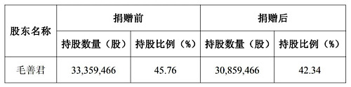 公告顯示,截至披露日,毛善君持有公司股份33359466股,占公司目前總股本的45.76%。為支持北京大學(xué)地球與空間科學(xué)學(xué)院教育事業(yè)的發(fā)展,更好地促進(jìn)其教學(xué)科研和人才培養(yǎng)工作,毛善君與北京大學(xué)教育基金會(huì)于7月2日簽署捐贈(zèng)協(xié)議,一次性向北京大學(xué)教育基金會(huì)無償捐贈(zèng)其持有的公司股票250萬(wàn)股。