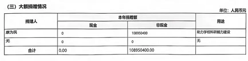哈爾濱工業(yè)大學(xué)教育發(fā)展基金會(huì)2024年度工作報(bào)告截圖記者查詢哈爾濱工業(yè)大學(xué)教育發(fā)展基金會(huì)2024年度工作報(bào)告發(fā)現(xiàn),2024年度基金會(huì)收到捐贈(zèng)人康為民的非現(xiàn)金捐贈(zèng),合計(jì)金額為108950400元,捐贈(zèng)用途為“助力學(xué)??蒲心芰ㄔO(shè)”。