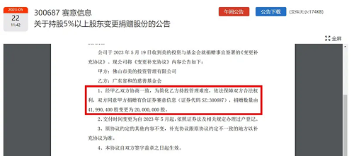 2020年6月21日,廣州賽意信息科技股份有限公司發(fā)布公告稱,廣州賽意信息科技股份有限公司持股5%以上股東——佛山市美的投資管理有限公司與廣東省和的慈善基金會(huì)簽署《捐贈(zèng)協(xié)議》,為推動(dòng)公益慈善發(fā)展,美的投資擬向基金會(huì)無(wú)償捐贈(zèng)公司股票41990400股,占公司總股本的10.54%。按照當(dāng)時(shí)的市值計(jì)算,這部分股權(quán)市值約為9.95億元。