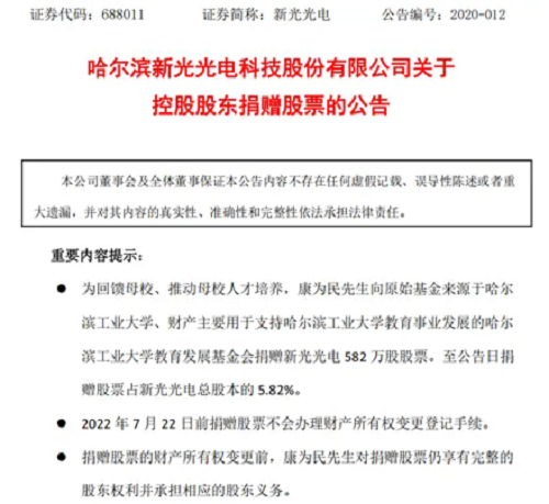 新光光電公告2020年6月2日,新光光電發(fā)布關(guān)于控股股東捐贈(zèng)股票的公告。公告稱,公司于2020年6月1日接到控股股東康為民通知,其與哈爾濱工業(yè)大學(xué)教育發(fā)展基金會(huì)簽署了《捐贈(zèng)協(xié)議書》。根據(jù)公告,為回饋母校、推動(dòng)母校人才培養(yǎng),康為民向哈爾濱工業(yè)大學(xué)教育發(fā)展基金會(huì)捐贈(zèng)新光光電582萬(wàn)股股票。至公告日,捐贈(zèng)股票占新光光電總股本的5.82%。按照當(dāng)時(shí)股價(jià)計(jì)算,這批股票價(jià)值高達(dá)2.4億元。