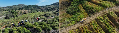 永順縣發(fā)樹村莓茶園采茶后運輸場景(左:人工,右:小火車)