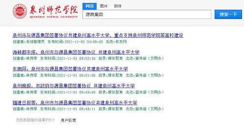 泉州師范學(xué)院官網(wǎng)搜索截圖那么,關(guān)于協(xié)議中提到的支持泉州師范學(xué)院等建設(shè)進展如何?記者通過源昌集團、泉州師范學(xué)院以及南安市慈善總會等機構(gòu)官網(wǎng)搜索,均未發(fā)現(xiàn)相關(guān)消息或進展。