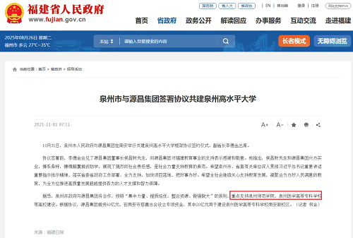 源昌集團微信公眾號文章稱,此舉是“為創(chuàng)建泉州醫(yī)學(xué)院的目標(biāo)做準備,目標(biāo)是建成一所高水平的泉州醫(yī)科大學(xué)”。