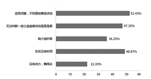 在實踐層面,信息閉塞和信任問題是影響參與公益慈善活動的首要障礙。超過半數(shù)的大學(xué)生受訪者因信息閉塞而無法獲知活動信息,近半數(shù)人因難以判斷公益活動的真實性而猶豫參與,反映出信息透明度和公信力的重要性。從前述大學(xué)生最愿意參加的公益慈善活動類型來看,他們喜歡參加范圍更加廣大、平臺更為社會化的公益慈善活動,但由于大學(xué)生自身接觸社會、認(rèn)識社會的機(jī)會不多,自身的實踐能力與社會化程度都不高,再加之信息閉塞和信任問題,是造成大學(xué)生參加公益慈善活動的意愿與實際存在一定錯位、活動范圍更多局限在社區(qū)的重要原因所在。有一些大學(xué)生(23.3%)表示自己曾經(jīng)參加過某個公益機(jī)構(gòu),但是后來斷掉了。這說明社會公益機(jī)構(gòu)與大學(xué)生關(guān)聯(lián)的緊密度還存在一定的提升空間。