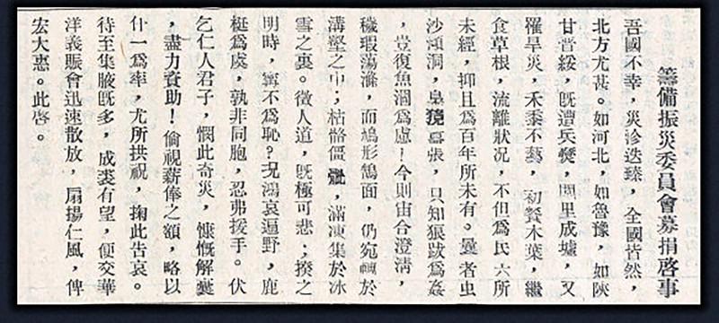 大學(xué)作為培育文明、教書育人的平臺(tái),是傳播與踐行慈善文化的重要基地。仔細(xì)追溯清華大學(xué)的歷史就會(huì)發(fā)現(xiàn),清華人早在建校初期就逐步形成公益慈善傳統(tǒng),并與清華精神的培育與完善相輔相成。有明確資料證明,在1937年之前的早期清華歷史上曾進(jìn)行過多次公益募捐活動(dòng),研討這些清華慈善實(shí)踐的史實(shí),感悟蘊(yùn)含其中的思想精華,對(duì)于清華大學(xué)的發(fā)展,仍然具有十分重要的現(xiàn)實(shí)意義。 早期清華所處的社會(huì)環(huán)境極其復(fù)雜,可以說,是在近代中國社會(huì)矛盾重重,外憂內(nèi)患頻頻的艱難時(shí)代中 “搞教育,做學(xué)問”,蹣跚前行,步步驚心。在不斷發(fā)生的天災(zāi)人禍面前,清華人一方面以堅(jiān)持大學(xué)教育的發(fā)展為己任,一方面也以各種形式為“賑災(zāi)扶貧,抗敵勞軍”竭盡“匹夫報(bào)國”的盡心之力。這些慈善行動(dòng)為百年清華的歷史留下了深刻的印記和寶貴的精神財(cái)富。 1928年組織旱災(zāi)捐助 根據(jù)史料記載,從1928年開始,中國北方發(fā)生過一場持續(xù)三年的罕見大災(zāi)荒。這場以旱為主,蝗、風(fēng)雪、雹、水、疫并發(fā)的巨災(zāi),以陜西、甘肅為中心,遍及山西、綏遠(yuǎn)、河北、察哈爾、熱河、河南等八省,并波及山東、蘇北、皖北、湖北、湖南、四川、廣西的一部或大部,形成了一個(gè)面積廣袤的災(zāi)區(qū)。這場災(zāi)荒史稱“民國十八年年饉”,并被歷史學(xué)家列為“中國近代十大災(zāi)荒”之一。 在災(zāi)情被媒體持續(xù)曝光之后,清華師生也被這場災(zāi)難的嚴(yán)重程度所震驚,并迅速采取募捐賑災(zāi)行動(dòng)。1928年12月20日,剛剛正式成立不久的國立清華大學(xué)設(shè)立“籌備賑災(zāi)委員會(huì)”,委員會(huì)由清華秘書長馮芝生、教務(wù)長楊金甫、外文系主任王立山教授、庶務(wù)科主任張仲魯、體育館主任馬約翰、學(xué)生評(píng)議部主席高琦、干事部主席張企泰以及學(xué)生代表李健吾、蘇宗固、容啟東、朱麗琛共11人組成,馮芝生任主席。時(shí)任校長羅家倫(1897—1969)參加了賑災(zāi)委員會(huì)第一次會(huì)議。會(huì)議對(duì)有關(guān)賑災(zāi)事宜進(jìn)行決議,希望教職員捐出每月薪金的十分之一。羅家倫校長和王立山主任當(dāng)場允諾捐出月薪金的十分之二,以為表率。 賑災(zāi)委員會(huì)于12月26日在《國立清華大學(xué)校刊》第一次登載了募捐啟事,其中寫道:“吾國不幸,災(zāi)診迭臻,全國皆然,北方尤甚?!醪湍救~,繼食草根,流離狀況,不但為民六所未經(jīng),抑且為百年所未有……征人道,既極可悲;揆之明時(shí),寧不為恥?況哀鴻遍野,鹿梃為虞,孰非同胞,忍弗援手。伏乞仁人君子,憫此奇災(zāi),慷慨解囊,盡力資助!倘視薪俸之額,略以什一為率,尤所拱祝。掬此告哀。待至集腋既多,成裘有望,便交華洋義賑會(huì)迅速散放,扇揚(yáng)仁風(fēng),俾宏大惠。”情真意切,躍然紙上! 在發(fā)出賑災(zāi)募捐啟事之后,賑災(zāi)委員會(huì)又于12月28日、31日連續(xù)在??系禽d有關(guān)災(zāi)情的報(bào)道和募捐辦法,同時(shí)在12月29日晚間在大禮堂組織了一場“賑災(zāi)游藝大會(huì)”,清華銅管樂隊(duì)參演,并請(qǐng)來一些當(dāng)時(shí)著名的昆曲名家、魔術(shù)師、演奏家獻(xiàn)藝。所得門票價(jià)款悉數(shù)轉(zhuǎn)為賑災(zāi)款。這種募捐形式也可以看作是發(fā)展至今的各類“賑災(zāi)義演”的雛形。 在這次巨大災(zāi)情中,中國華洋義賑會(huì)、中國紅十字會(huì)、世界紅卍字會(huì)、中國濟(jì)生會(huì)等社會(huì)救助團(tuán)體在賑災(zāi)工作中扮演著重要角色,發(fā)揮了舉足輕重的作用。這些社會(huì)救助團(tuán)體主要通過募集與發(fā)放賑款、衣物,開辦粥廠,開設(shè)災(zāi)民收容所,發(fā)放貸款、種子等措施開展救濟(jì)工作。當(dāng)年清華的賑災(zāi)善款主要是通過華洋義賑會(huì)轉(zhuǎn)賑。經(jīng)過三個(gè)月的募捐,清華全校師生員工募集的善款超過2000元。 1929年4月1日,??禽d中國華洋義賑救災(zāi)總會(huì)來函,告知收到清華全校師生員工募集的2225.58元善款,并已“歸入急賑??铐?xiàng)下購糧匯放”。在大規(guī)模募捐之后,在??先钥梢园l(fā)現(xiàn)有師生陸續(xù)捐款的報(bào)道,如外國語文系教授翟孟生一次捐款30大洋,舊大一學(xué)生捐款22元等。 1931年組織水災(zāi)捐助 在中國近代史上,1931年發(fā)生過一次迄今為止最嚴(yán)重的水災(zāi)。據(jù)史料稱,這一年中國氣候反常,大面積降雨。從5月下旬開始,長江、黃河、淮河、松花江、遼河、鴨綠江流域都持續(xù)降雨,時(shí)間竟長達(dá)三個(gè)月之久。水災(zāi)區(qū)域南到珠江流域,北至長城關(guān)外,東起江蘇北部,西至四川盆地,范圍之廣前所未有,造成的災(zāi)民數(shù)量起碼達(dá)到1億人,死亡人數(shù)約400萬,經(jīng)濟(jì)損失不計(jì)其數(shù)。饑餓、寒冷、傳染病的肆意侵襲,更多的人死于洪災(zāi)之后的饑荒與疾病,可謂“生靈涂炭、滿目瘡痍”。由此,這次災(zāi)害被列為世界十大最嚴(yán)重的自然災(zāi)害之一。 面對(duì)這場讓處于多事之秋的中華民族幾近于“九死之絕境”的天災(zāi),清華人再次表現(xiàn)出“仁者之心”,慷慨